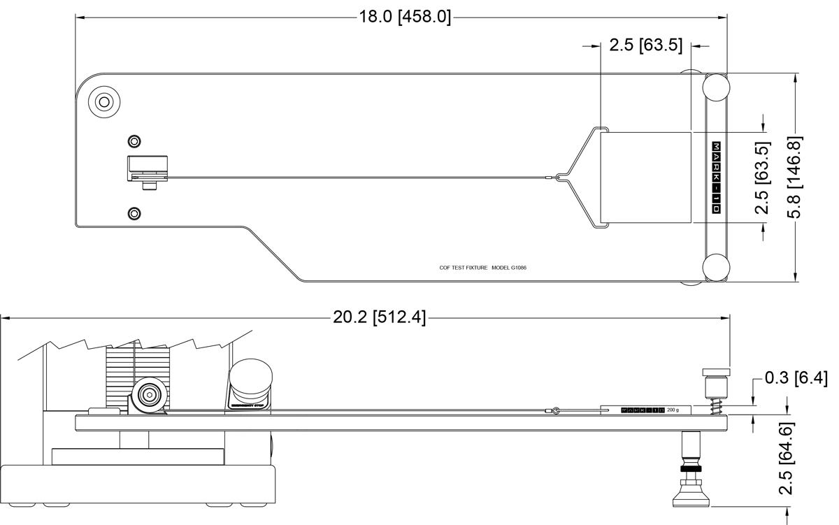 The fixture includes a large work table with sample clamp, level, 200 g sled, cable, and low-friction pulley. The fixture is compatible with most Mark-10 motorized force frames (some models require an adapter; see Ordering Information).