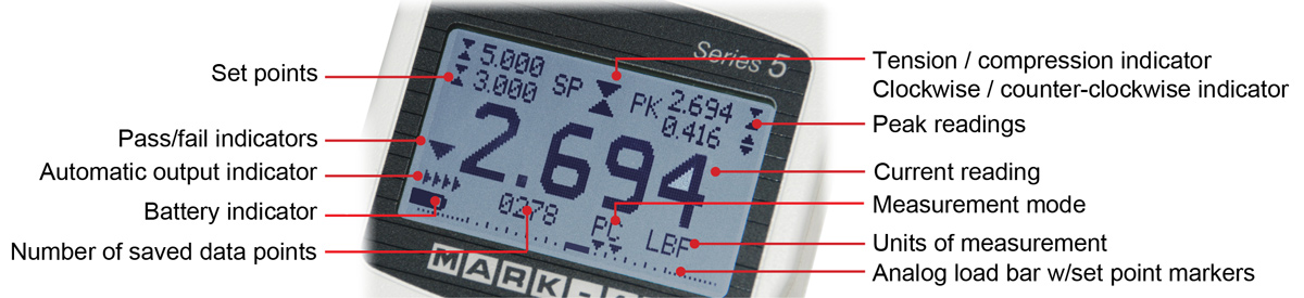 On-board data memory for up to 1,000 readings is included, as are statistical calculations with output to a PC. Integrated set points with indicators and outputs are ideal for pass-fail testing and for triggering external devices such as an alarm, or relay. An analog load bar is shown on the display for graphical representation of applied force or torque.