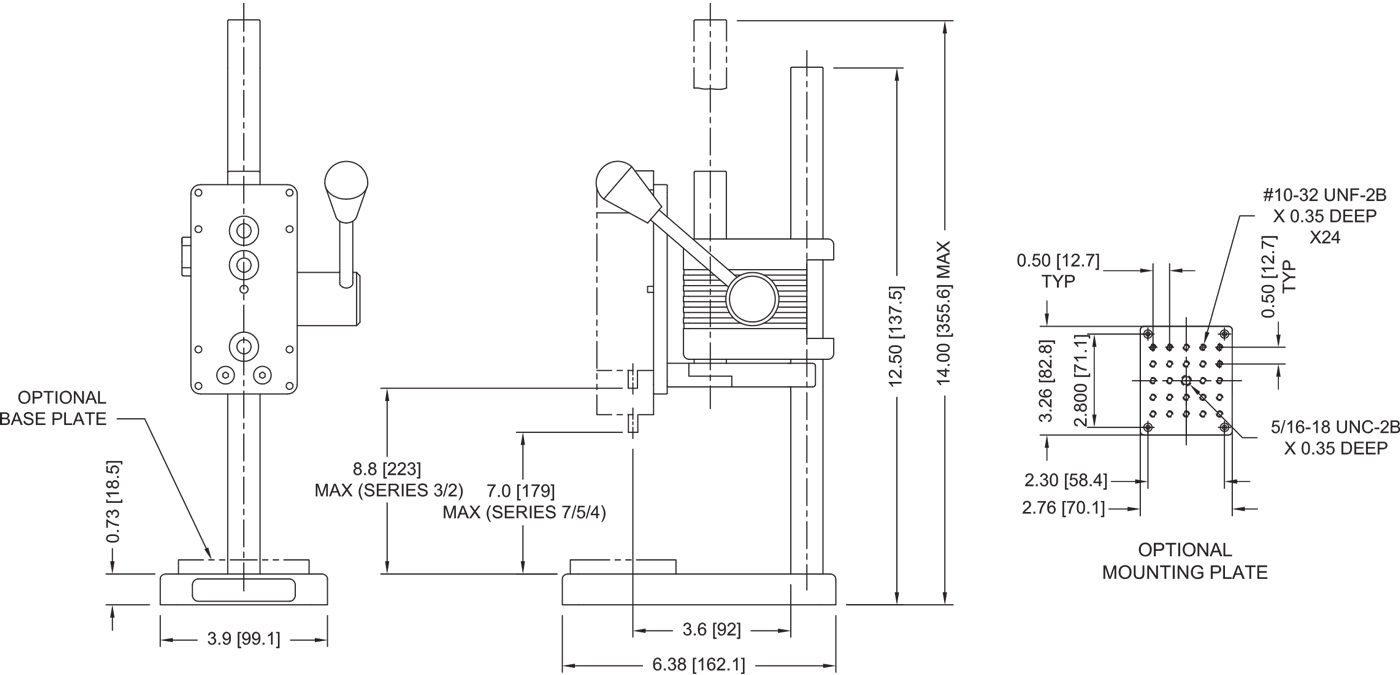 - Optional base plate with 25 #10-32 threaded holes for fixture mounting
