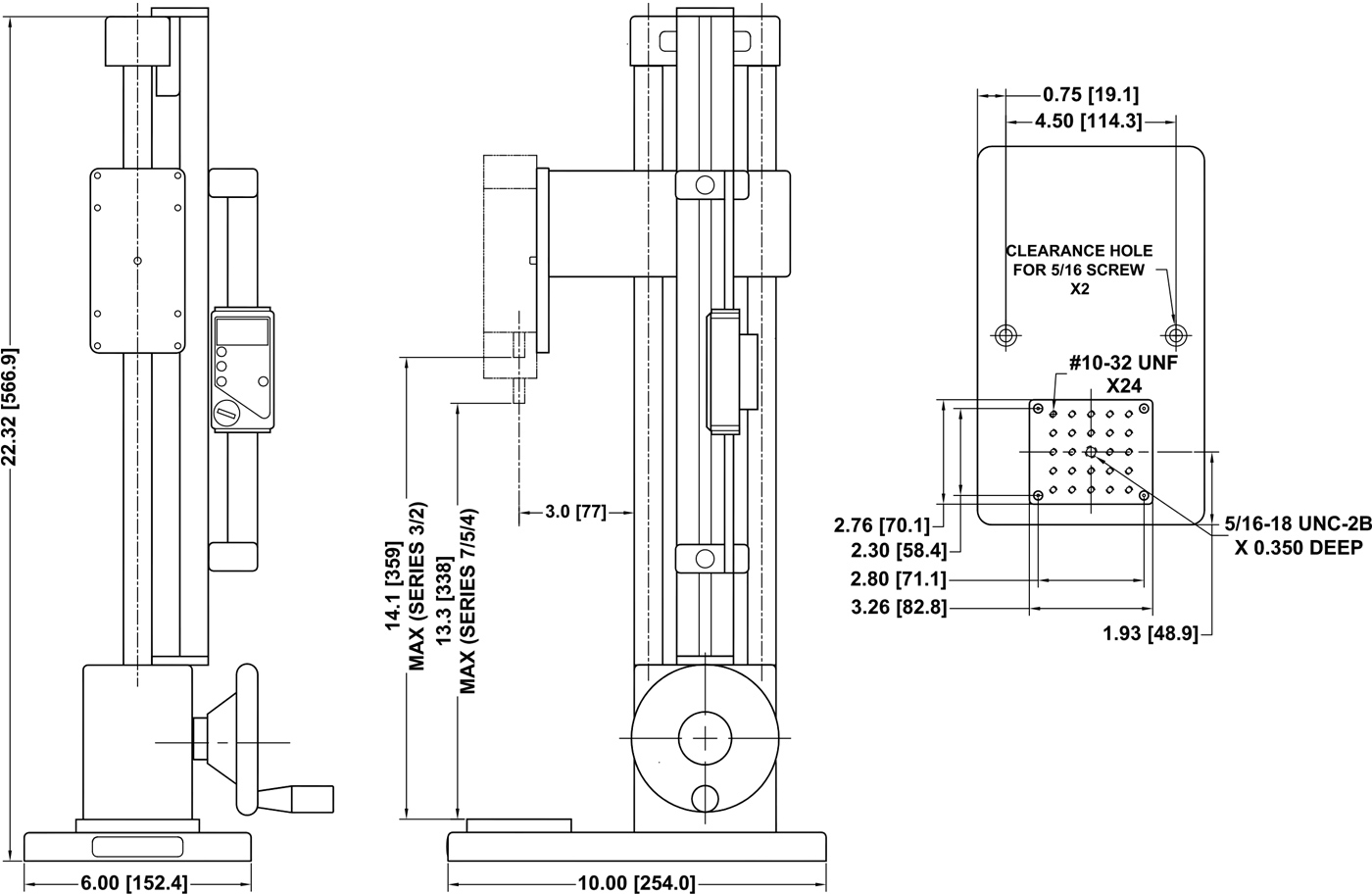 • Removable base plate with 25 #10-32 threaded holes for fixture mounting.