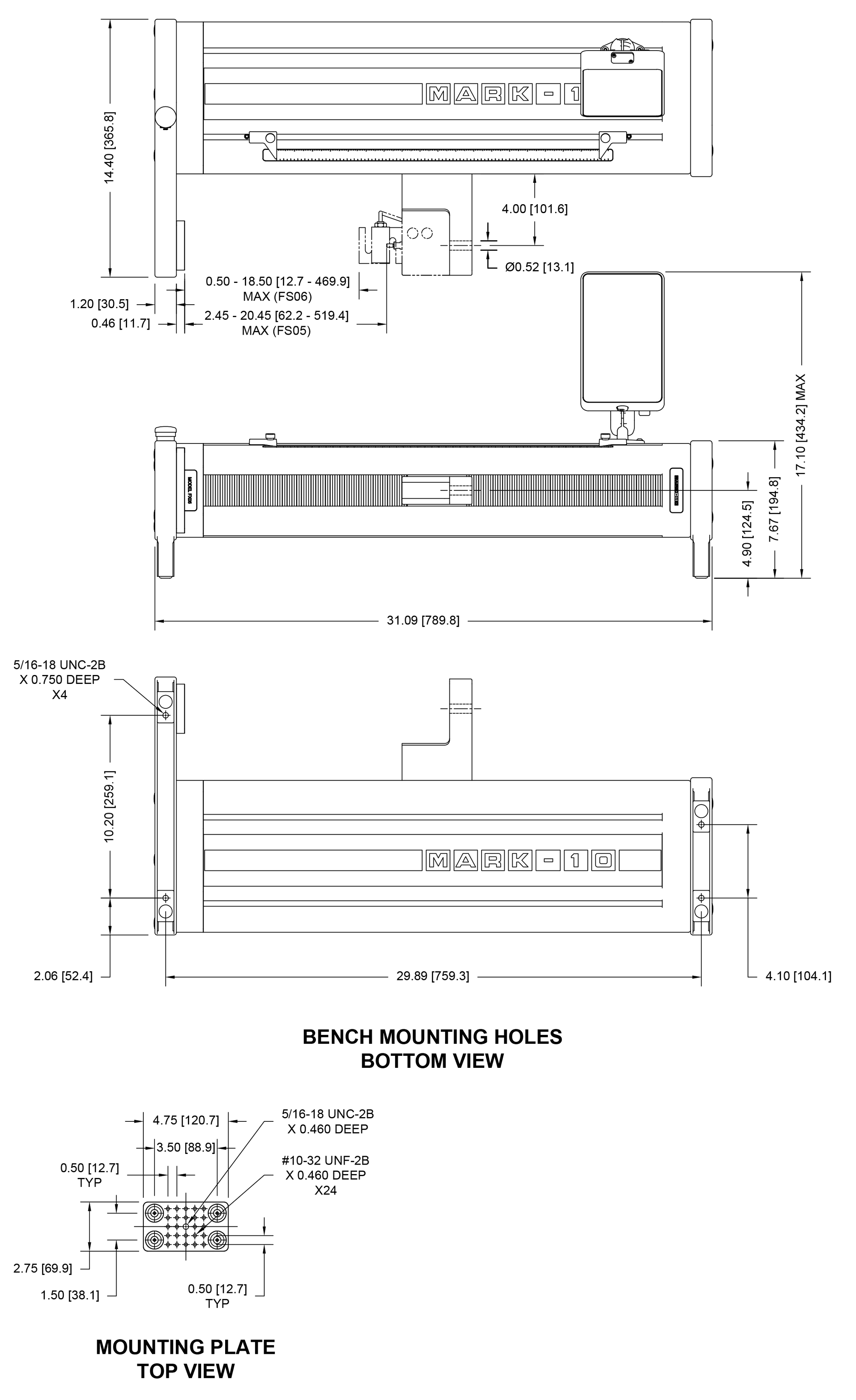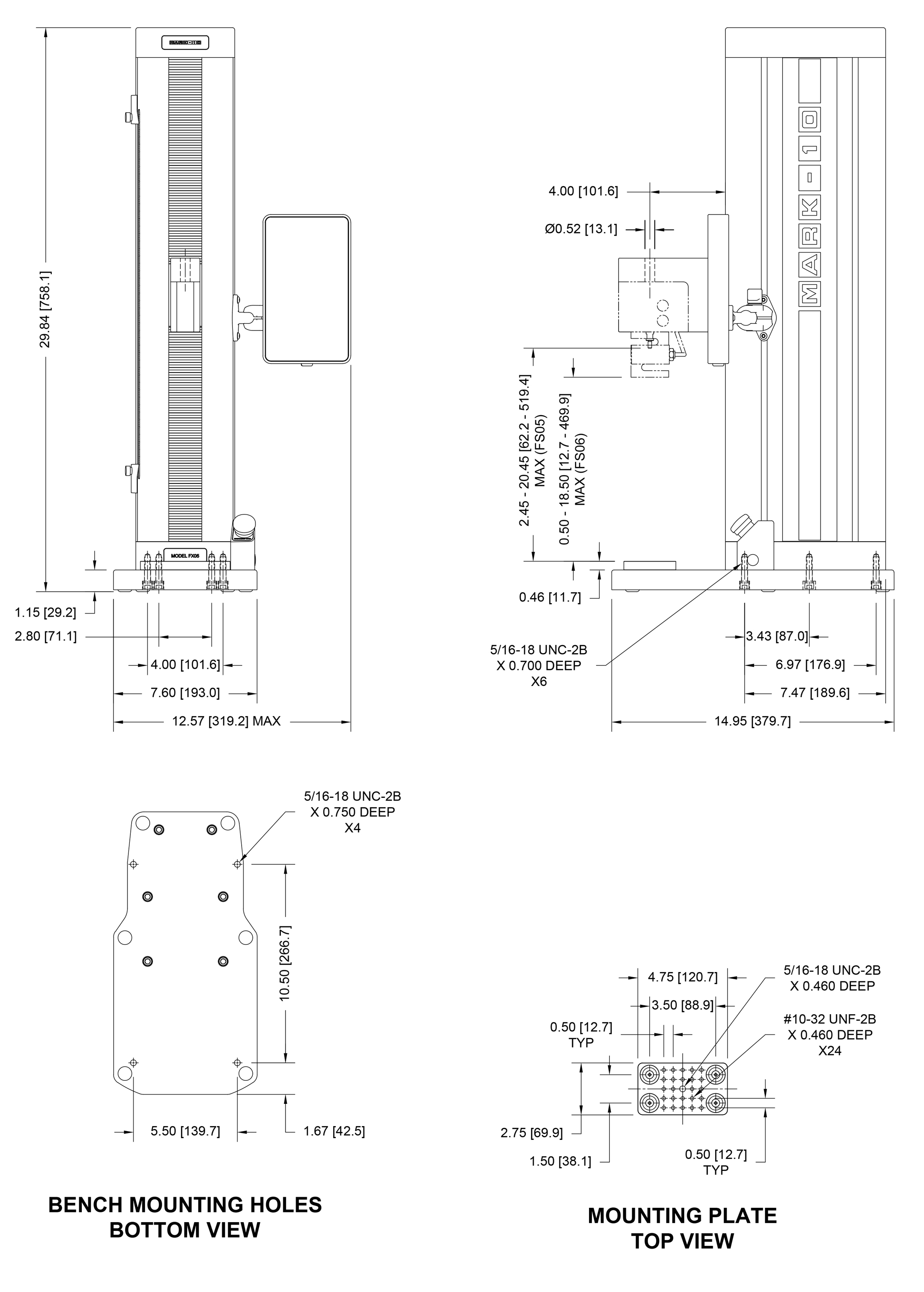Double column extensions (AC1095-1 / -2 / -3) Accommodate up to a 20 in. [508 mm] wide sample, or ø21.5 in [ø546 mm] round sample. Select from 6, 12 and 24 in [150, 300, and 600 mm] heights. The base contains rows of T-slots for fixture mounting. Not compatible with Mark-10 shields. |