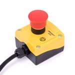 Remote emergency switch (AC1074) Convenient for when the standard emergency switch is inaccessible, for example, if a shield is used (the remote emergency switch is included with Mark-10 shields). Includes an 8’ (2.4 m) cable and plugs directly into the rear of the test frame. AC1125-1 or AC1125-2 emergency switch connector option is required for Series F frames. The standard, attached emergency switch remains operational while the remote switch is plugged in. |