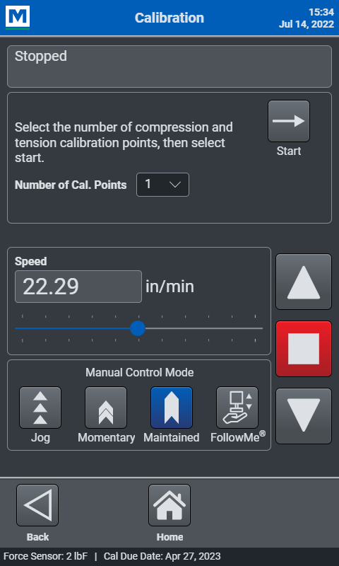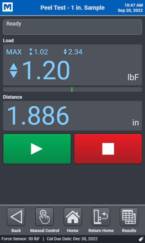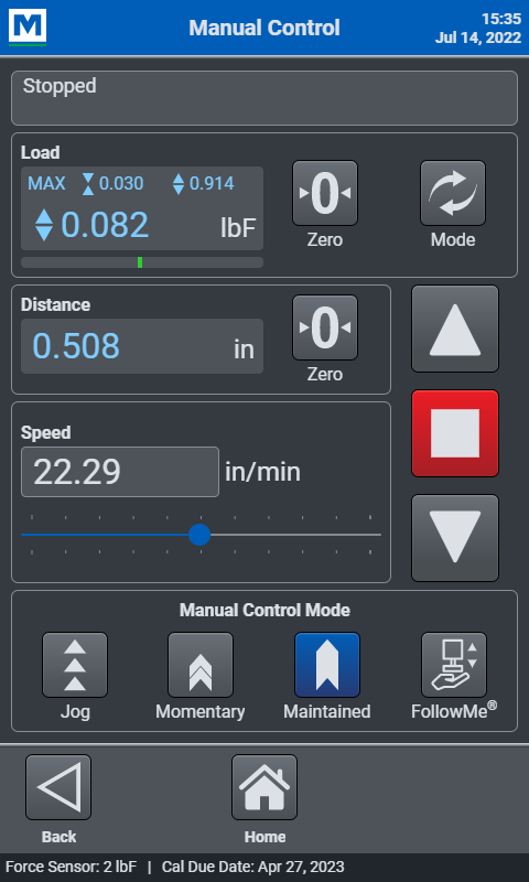 Manually control the test frame to obtain quick load and distance results, or manually position the crosshead prior to a test. Select from several actuation methods, including momentary (button-hold), maintained (button release) motion, jog mode with three distance presets, and FollowMe® force-based positioning.