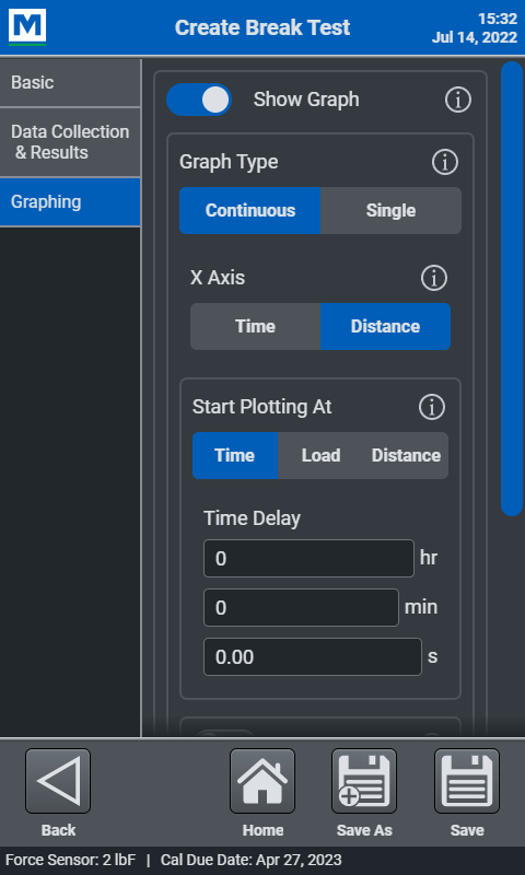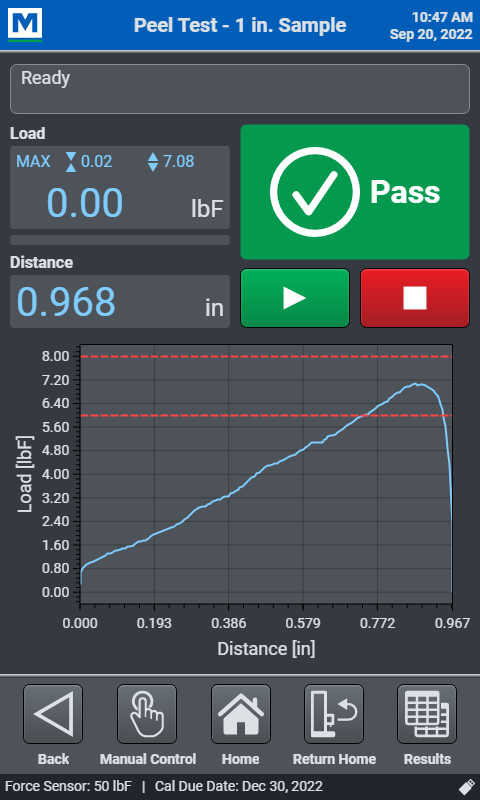 - View a graph of load vs. time or load vs. distance (Distance Measurement function required).