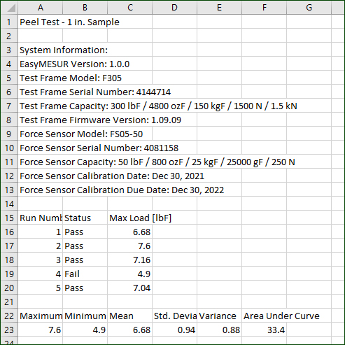 - Each run includes the run number, pass/fail status, and result, such as a maximum compression load.