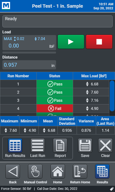- View and save all data points collected during a run, including reading number, load, elapsed time, and distance (Distance Measurement function required).