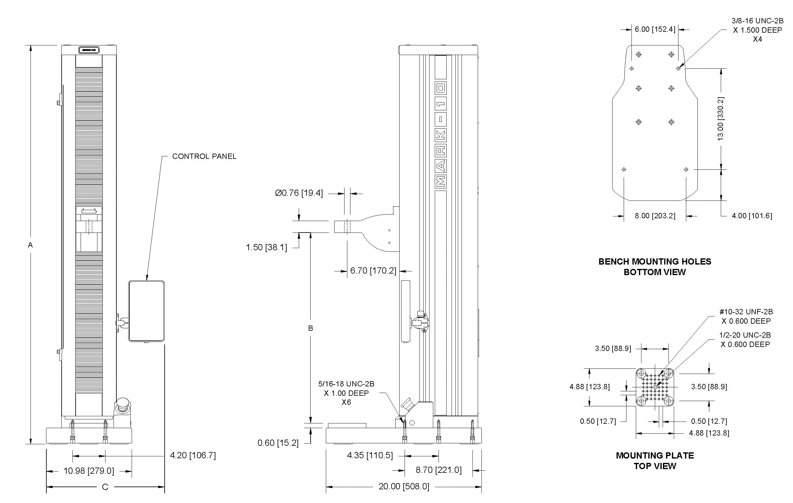 Control panel tabletop mounting kit (AC1085) For applications requiring remote use of the control panel. Features an adjustable viewing angle and a base with thru holes for bench mounting. |